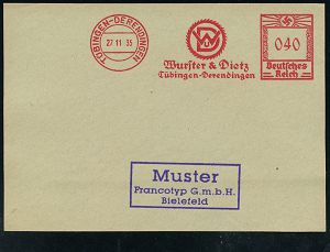 4575 | 35 € | 7400 TÜBINGEN : TÜBINGEN-DERENDINGEN/ WuD/ Wurster & Dietz.. 1935 (27.11.) AFS-Musterabdruck Francotyp "Hakenkreuz" (Monogr.-Logo) glasklar gest. Francotyp-Musterblatt vom V o r - Ersttag ! (mit Attest), selten! (Dü.E-3CEo) | ![]() ![]() | |