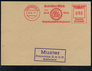 4577 | 35 € | 7400 TÜBINGEN : TÜBINGEN 1/ Gebrüder Möck/ ..Bleckröhrenfabrik-Verzinkerei 1937 (23.12.) AFS-Musterabdruck "Reichsadler" (Ofenrohr-Logo) glasklar gest. Francotyp-Musterblatt vom V o r - Ersttag! (mit Attest), selten! (Dü.E-5CGo) | ![]() ![]() | |