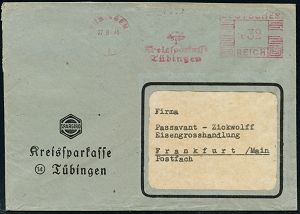 4585 | 25 € | 7400 TÜBINGEN : TÜBINGEN/ 1/ Kreissparkasse/ Tübingen 1946 (27.8.) AFS Francotyp "Mäanderrechteck" unverändert weiterverwendet mit Inschrift "DEUTSCHES REICH" = Notmaßnahme! (Logo: Mekurkopf, zeitbedingt Maschine abgenutzt!) Firmen-Fern-Bf., vergl. Kat.Nr.4580 u. 4587! (Dü.E-2CEh, unverändert !) | ![]() | |