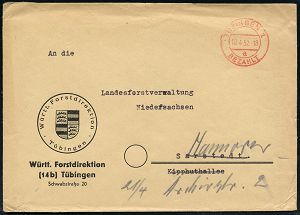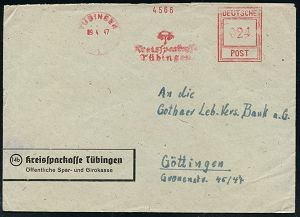 4587 | 20 € | 7400 TÜBINGEN : TÜBINGEN/ 1/ Kreissparkasse.. 1947 (9.4.) seltener AFS Francotyp "Hochrechteck" (stilis. Hermeskopf) Firmen-Bf. m. Göttingen, vergl. Kat.-Nr. 4580 u.4585 (Dü.E-18CEh, nur maximal 1 1/2 Jahre verwendet!) | ![]() | |
