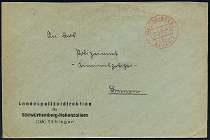 4597 | 10 € | 7400 TÜBINGEN : (14a) TÜBINGEN 1/ cc/ BEZAHLT 1955 (16.3.) 2K-PFS mit PLZ u. Uhrzeit auf Dienst-Bf.: Landespolizeidirektion für Südwürttemberg-Hohenzollern.. (Dü.A-7, Nr.32 b) | ![]() | |