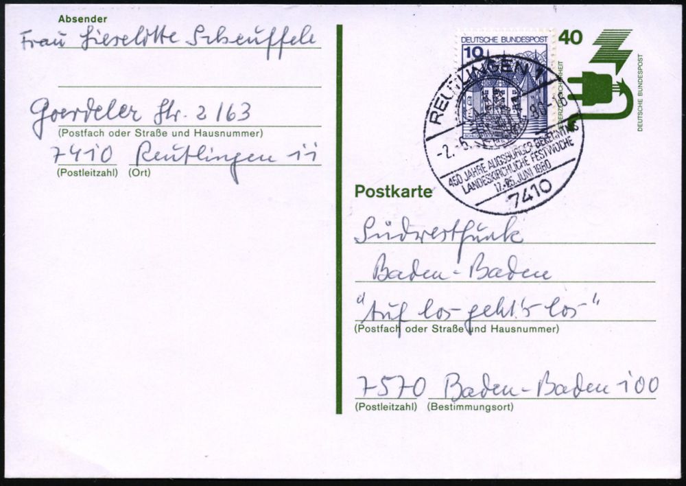 4753 | 12 € | 7410 REUTLINGEN : 7410 REUTLINGEN 1/ 450 JAHRE AUGSBURGER BEKENNTNIS/ LANDESKIRCHLICHE FESTWOCHE 1980 (2.6.) HWSt (Siegel) Bedarfs-Kt.! (Bo.45 , nur 1 1/2 Monate verwendet!) | ![]() | |