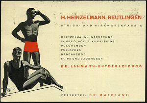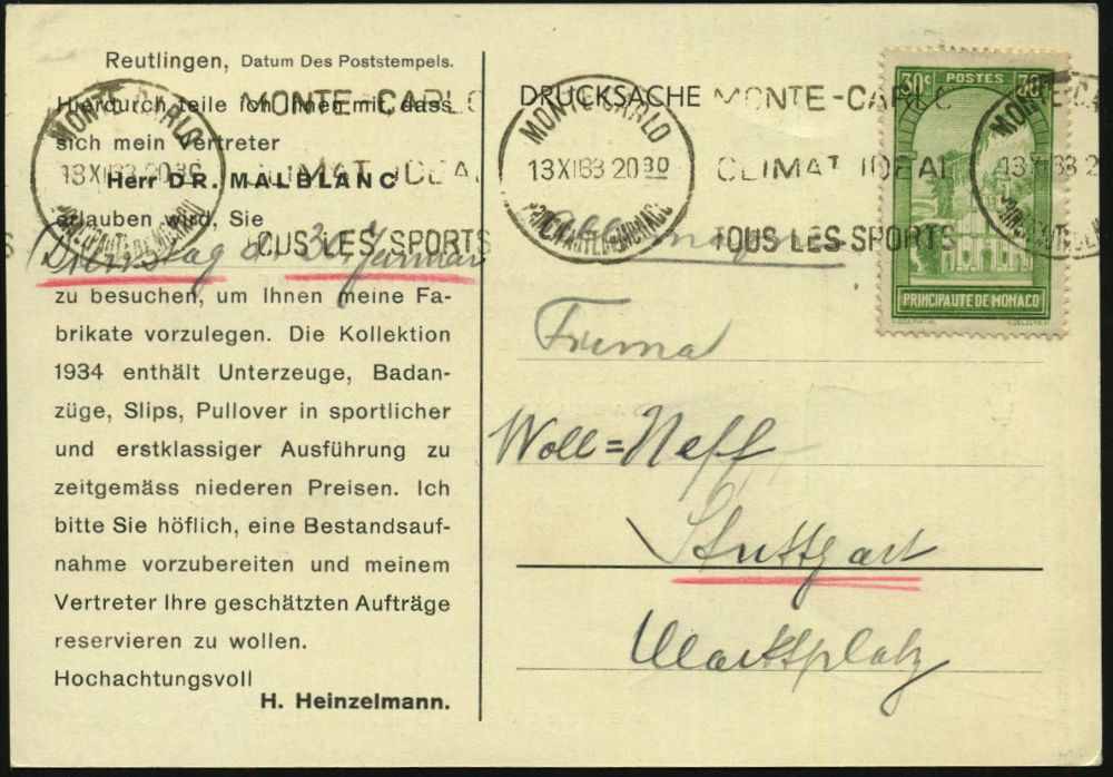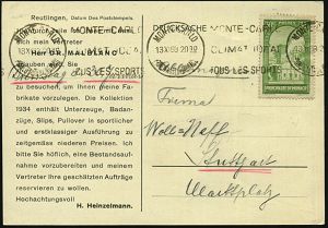 4743 | 18 € | 7410 REUTLINGEN : Reutlingen 1933 (13.12.) zweifarbige Reklame-Ak.: H. HEINZELMANN, REUTLINGEN..: Bademode mit Frankatur MONACO und BdMWSt.: MONTE CARLO/..TOUS LES SPORTS , Ausl.-Kt. n. Stuttgart | ![]() ![]() | |