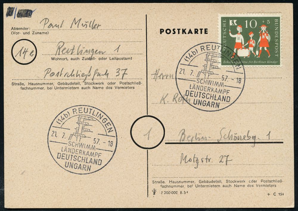 4747 | 15 € | 7410 REUTLINGEN : (14b) REUTLINGEN/ SCHWIMM/ LÄNDERKAMPF/ DEUTSCHLAND/ UNGARN 1957 (20.7.) SSt = Sprungturm auf EF 10 + 5 Pf. Wofa (Mi.250 EF + 18.- EUR), klar gest. Inl.-Karte (Bo.21) | ![]() | |