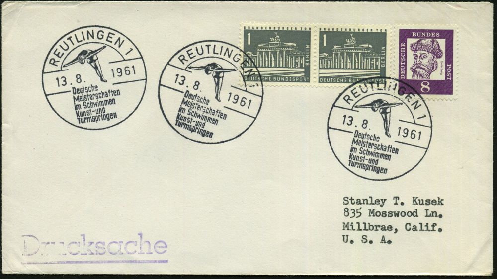 4751 | 16 € | 7410 REUTLINGEN : REUTLINGEN 1/ Deutsche / Meisterschaften/ im Schwimmen/ Kunst-u./ Turmspringen 1961 (13.8.) SSt = Springerin , 3x klar auf Übersee-Bf. n. USA (Bo.25 Finaltag) | ![]() | |