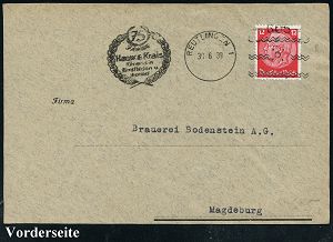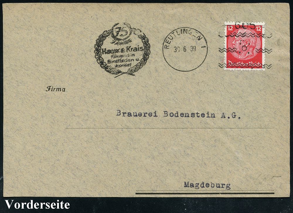 4745 | 28 € | 7410 REUTLINGEN : REUTLINGEN 1/ =605=/ 75 JAHRE/ Haux & Krais/ Führend in/ Bindfaden u./ Kordel 1939 (30.6.) seltener Freimarkenstempel = Vorausentwertung durch Frankierautomat (von der Fa. Telefonbau & Normalzeit) kleine Bedarfs-Vorderseite | ![]() | |