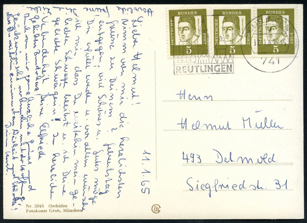 4752 | 10 € | 7410 REUTLINGEN : 741 REUTLINGEN 1/ a/ ..REUTLINGEN 1965 (12.1.) MWSt auf 3x 5 Pf. Albertus Magnus (Mi.347y MeF) , Bedarfs-Fern-Kt., in dieser Form nur 2 Jahre möglich! | ![]() | |