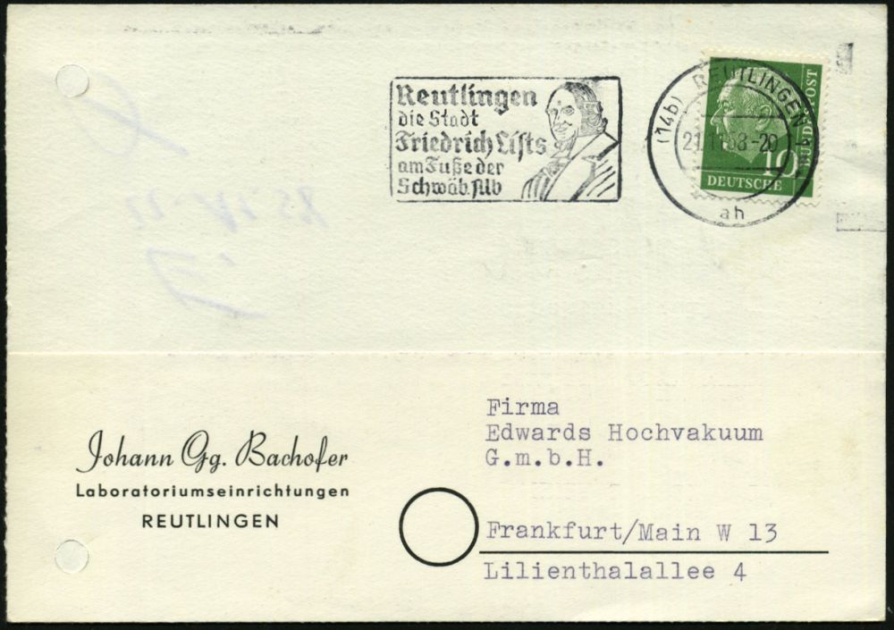 4748 | 10 € | 7410 REUTLINGEN : (14b) REUTLINGEN 1/ ah/ die Stadt/ Friedrich Lists.. 1958 (Nov.) MWSt = Brustbild List = Vorkämpfer des "Deutschen Zollvereins", Eisenbahn-Pionier etc., klar gest. (unsichtbar gelochte) Firmen-Kt.: Joh. G. Bachhofer.. (Bo.4 A Ty.VI = Erstjahr!) | ![]() | |