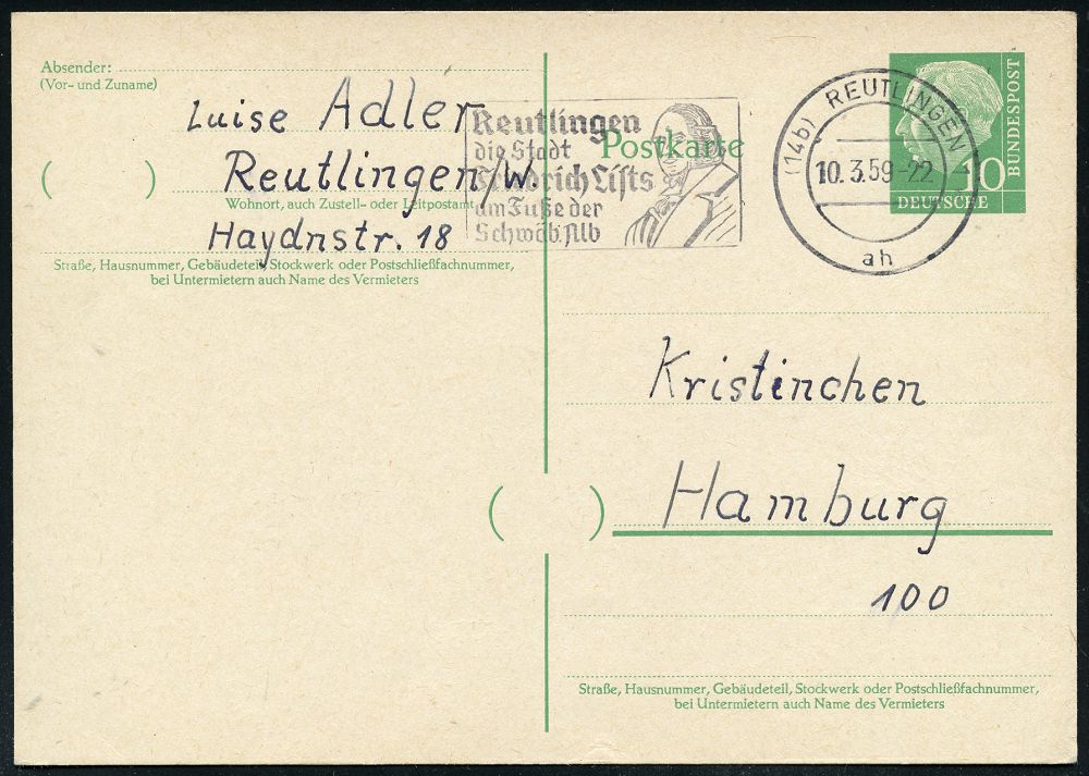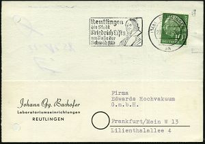 4749 | 10 € | 7410 REUTLINGEN : (14b) REUTLINGEN 1/ ah/ die Stadt/ Friedrich Lists.. 1959 (10.3.) MWSt = Brustbild List = Vorkämpfer des "Deutschen Zollvereins", Eisenbahn-Pionier etc., klar gest. Bedarfs-P 10 Pf. Heuss I (Bo.4 A Ty.VI) | ![]() | |