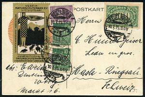 4742 | 25 € | 7410 REUTLINGEN : REUTLINGEN/ *1k 1923 (10.7.) 1K-Brücke mehrfach auf Werbe-Vignette: VEREIN/NATURSCHUTZPARK EV./SITZ STUTTGART (Ritter wacht über Wald u.Wildtieren) mit der 480 Mk. Infla-Frankatur abgestempelt!, Bedarfs-Ausl.-Kt. in die Schweiz | ![]() | |