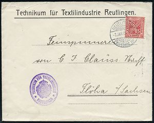 4741 | 18 € | 7410 REUTLINGEN : REUTLINGEN/ a/ POSTAMT Nr.1 1909 (7.1.) 1K-Gitter auf EF 10 Pf. Dienst, rot + viol. Oval-HdN: TECHNIKUM FÜR TEXTILINDUSTRIE.. (Wappen) Dienst-Fern-Bf.: Technikum für Textilindustrie.. n. Flöha/Sa., rs. AS. (Mi.D 115 EF) | ![]() | |