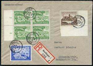 4744 | 25 € | 7410 REUTLINGEN : REUTLINGEN 1940 (13.4.) nachverwendeter, Alt-Württbg.-2K-Stempel (Feu.131) 4x auf WHW-Frankatur + RZ: Reutlingen 1/f (Bf. Mittelfalte) klar gest. Inll.-R-Bf. (schwache Falte) = Spätverwendung Stempeltype! (Mi.730, 4x 732, 777, + 18.-EUR) | ![]() | |