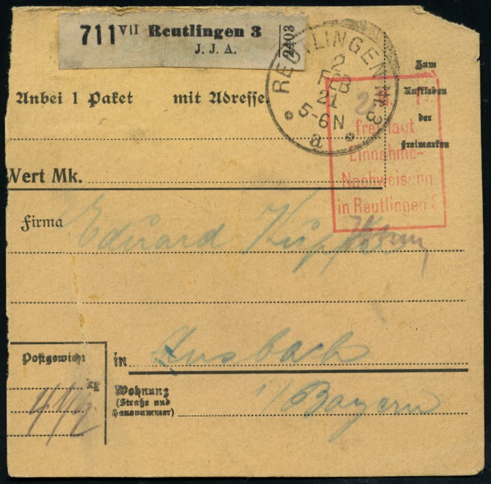 4754 | 18 € | 7410 REUTLINGEN : REUTLINGEN Nr.3/ ** 1921 (2.2.) 1K + roter Ra.5: M. Pf./frei laut/Einnahme-/Nacheisung/in Reutlingen + schw. Selbstbucher-Paketzettel: Reutlingen 3/J. J. A., Inl.-Selbstbucher-Paketkt. (kl. Eckfehler) n. Ansbach | ![]() ![]() | |