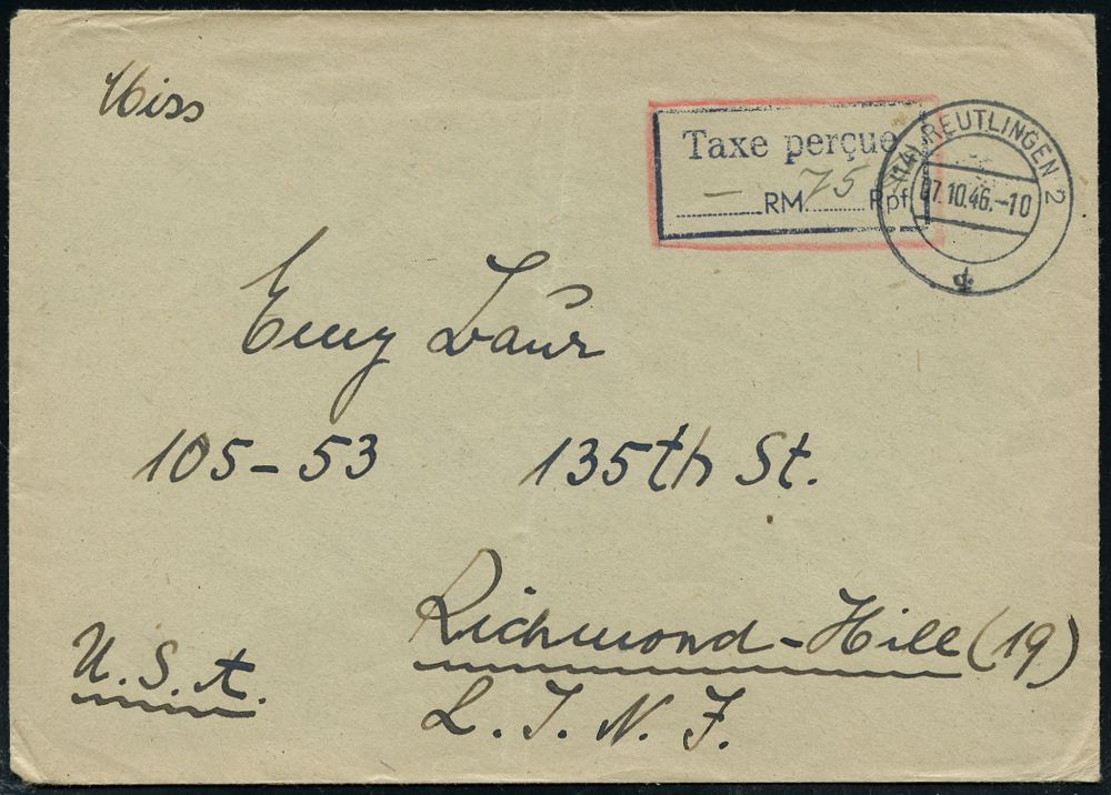 4771 | 18 € | 7410 REUTLINGEN : (14) REUTLINGEN 2/ d 1946 (7.10.) 2K-Steg + viol. Ra.2.: Taxe percue/...RM...RPf., hs. "75" (RPf.) rs. Abs.-Vordruck: E. CONZELMANN (schwache Mittelfalte) klar gest. Übersee-Bf. n.USA | ![]() ![]() | |