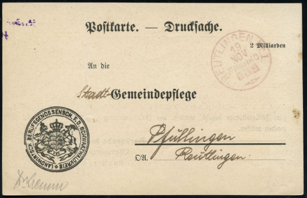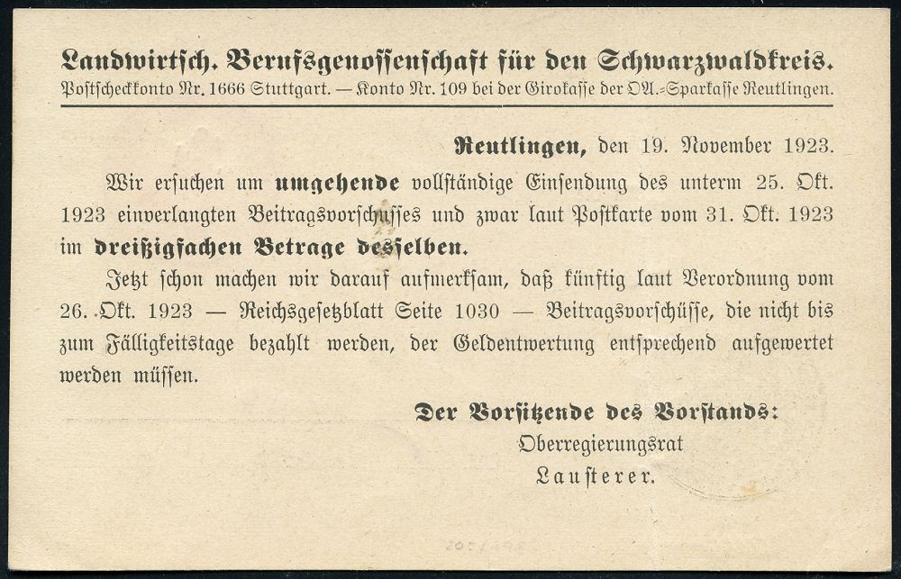 4755 | 35 € | 7410 REUTLINGEN : REUTLINGEN/ Nr.1/ FRANKO 1923 (19.11.) ehem. württembg. 1K-PFS = Notentwertung Hoch-Inflation = 500 Millionen, Porto-Letzttag!! auf Dienst-Karte: LANDWIRTSCHATL. BERUFSGENOSSENSCH. K. D. SCHWARZWALDKREIS (Mittelbugspur) noch mit königl. Wappen, betrifft: Geldentwertung u. Gebühren, Zeit-Beleg der Krise! (Dü.A-3, Nr.9) | ![]() ![]() | |