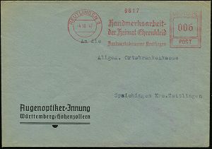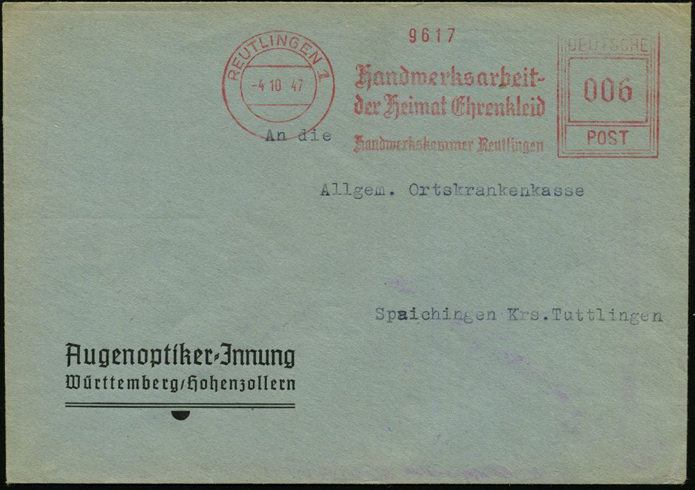 4775 | 18 € | 7410 REUTLINGEN : REUTLINGEN 1/ ..Handwerkskammer.. 1947 (4.10.) AFS Francotyp "Hochrechteck" auf Dienst-Bf.: Augenoptiker-Jnnung.. (Dü.E-18CGh, nur 1946-47 verwendet) | ![]() | |