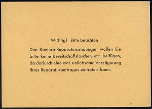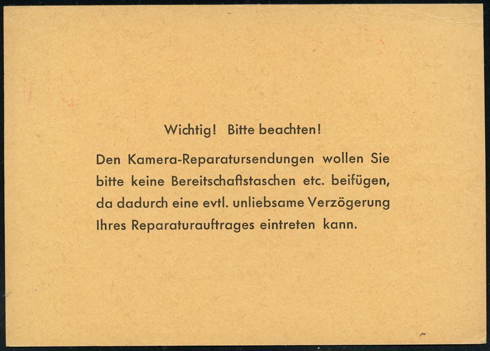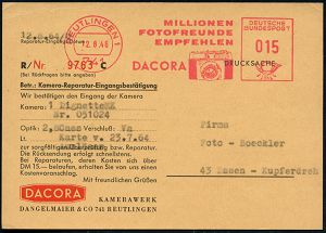 4782 | 18 € | 7410 REUTLINGEN : 741 REUTLINGEN 1/ MILLIONEN/ FOTOFREUNDE/ EMPFEHLEN/ DACORA 1964 (12.8.) AFS Francotyp "Francotyp" (Stempelirrtum 1946 statt 1964) = Kamera auf Firmen-Reparatur-Kt.: DACORA KAMERAWERK, DANGELMAIER & CO.. (Dü.E-23CO) | ![]() ![]() | |