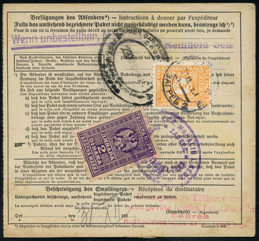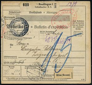 4756 | 30 € | 7410 REUTLINGEN : REUTLINGEN/ **/ Gebühr bezahlt 1927 (17.12.) Oval-PFS ohne Wertangabe u. Uhrzeit + schw. Selbstbucher-Paketzettel: L Reutlingen 1/ Selbstbucher R. S. = Fa. Reinhold Seitz + schw. Leitzettel: Ulm (Donau), klar gest. Ausl.-Selbstbucher-Paket-Kt. n. Zagreb, rs. jugoslaw. Tax- u. Fiskalmarken (Dü.A-5, Nr.15 a) | ![]() ![]() | |