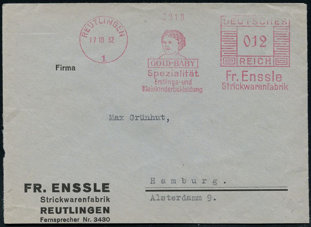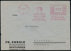 4759 | 20 € | 7410 REUTLINGEN : REUTLINGEN/ 1/ GOLD-BABY/ ..Erstlings-u./ Kleinkinderbekleidung 1932 (17.10.) AFS Francotyp "Mäanderrechteck" (= Kinderkopf) auf gering verkürztem Firmen-Bf.: FR. ENSSLE, Strickwarenfabrik.. (rs. Klappenmäg.) n. Hamburg (Dü.E-2CEh) | ![]() | |