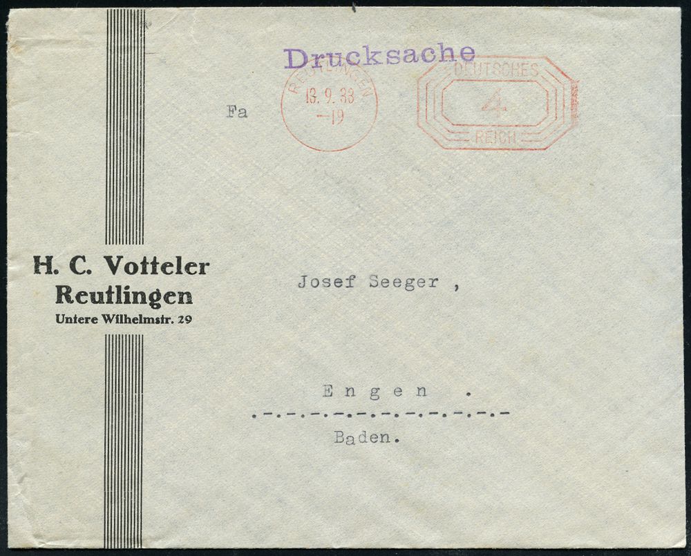 4760 | 8 € | 7410 REUTLINGEN : REUTLINGEN/ DEUTSCHES REICH 1933 (13.4.) PFS "Achteck" 4 Pf. auf Firmen-Bf.: H. C. Votteler.. (Dü.D-4) | ![]() ![]() | |