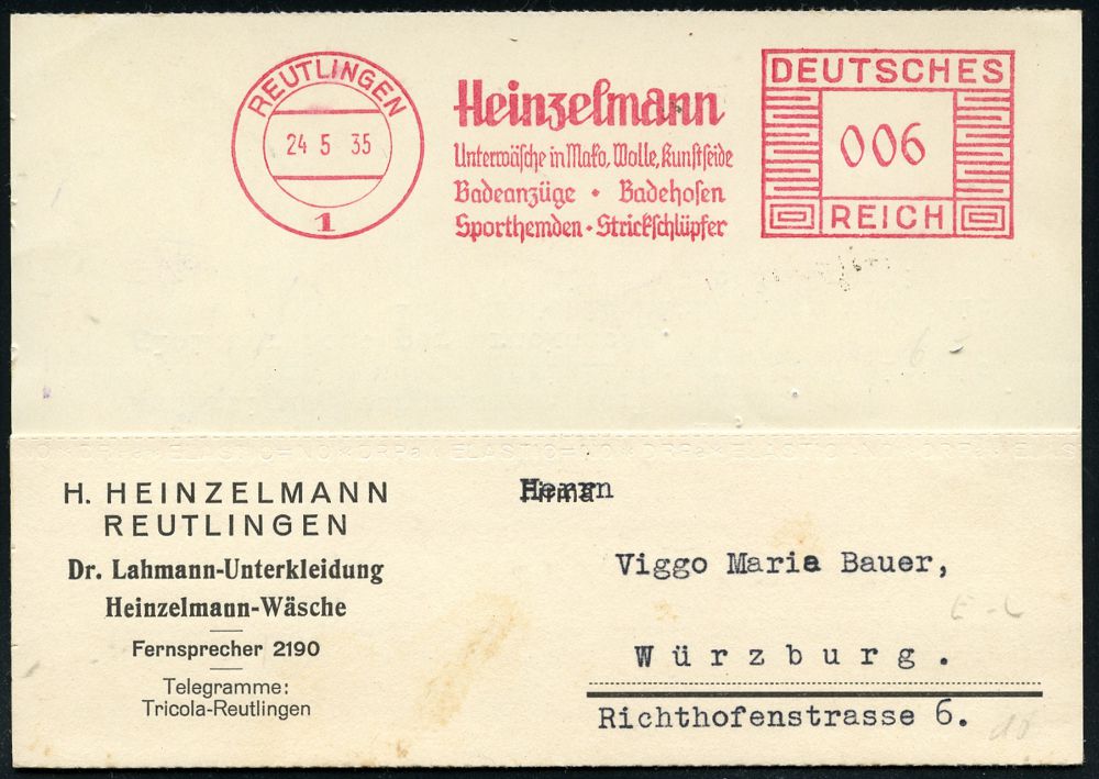 4763 | 18 € | 7410 REUTLINGEN : REUTLINGEN/ 1/ Heinzelmann/ Unterwäsche in Mako,Wolle,Kunstseide/ Badeanzüge.. 1935 (24.5.) AFS Francotyp "Mäanderrechteck" klar auf Firmen-Kt.: H. HEINZELMANN:: Heinzelmann-Wäsche n. Würzburg (Dü.E-2CEo) | ![]() ![]() | |