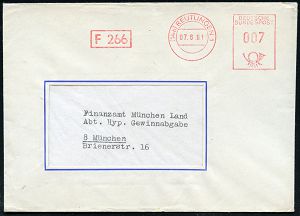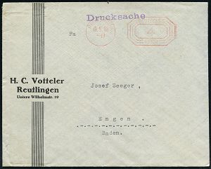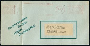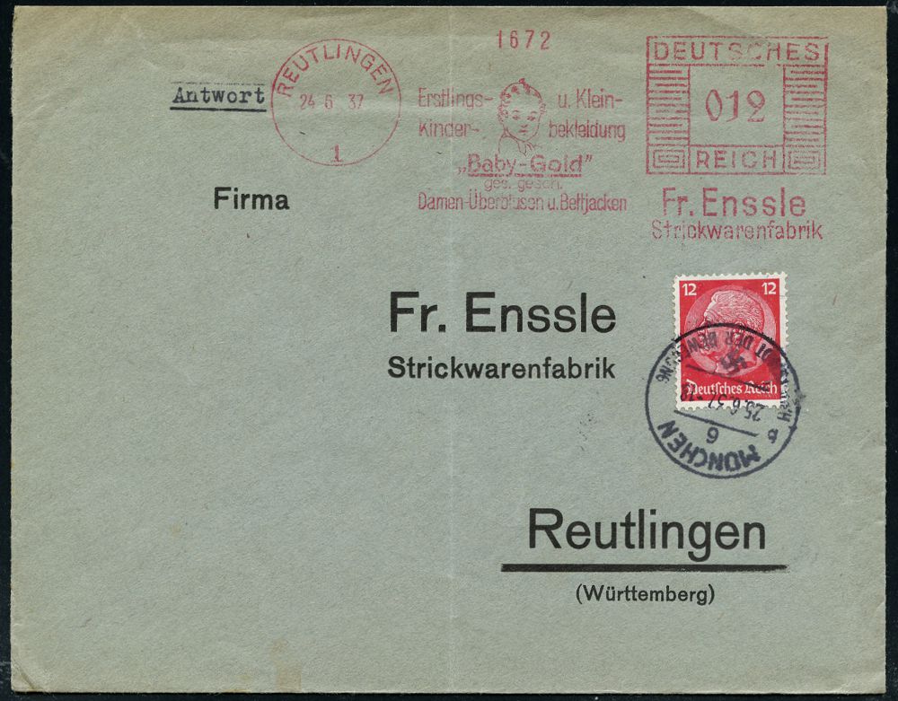 4764 | 28 € | 7410 REUTLINGEN : REUTLINGEN/ 1/ Erstlings- u.Klein-/ kinderbekleidung/ "Baby-Gold"../ Fr.Enssle/ Strickwarenfabrik 1937 (24.6.) AFS Francotyp "Mäanderrechteck" 012 Pf. auf vorausfrankiertem Firmen-Antwort-Bf.: Fa. Fr. Enssle.. Reutlingen (daher gefaltet) irrtümlich neu frankiert mit EF 12 Pf. Hindenbg. (Mi.519 EF) HWSt.: MÜNCHEN 6/b/HDB, selten! (Dü.E-2CEh) | ![]() | |