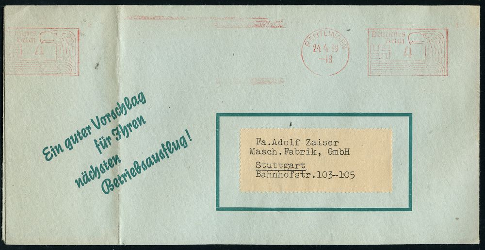 4765 | 15 € | 7410 REUTLINGEN : REUTLINGEN/ Deutsches/ Reich 1939 (24.4.) PFS "Adlerkopf/Hakenkreuz" 4 Pf. , zweiter Wertrahmen links! (Bf. gefaltet) Firmen-Bf.: Ein guter Vorschlag.. (Dü.D-6) | ![]() | |