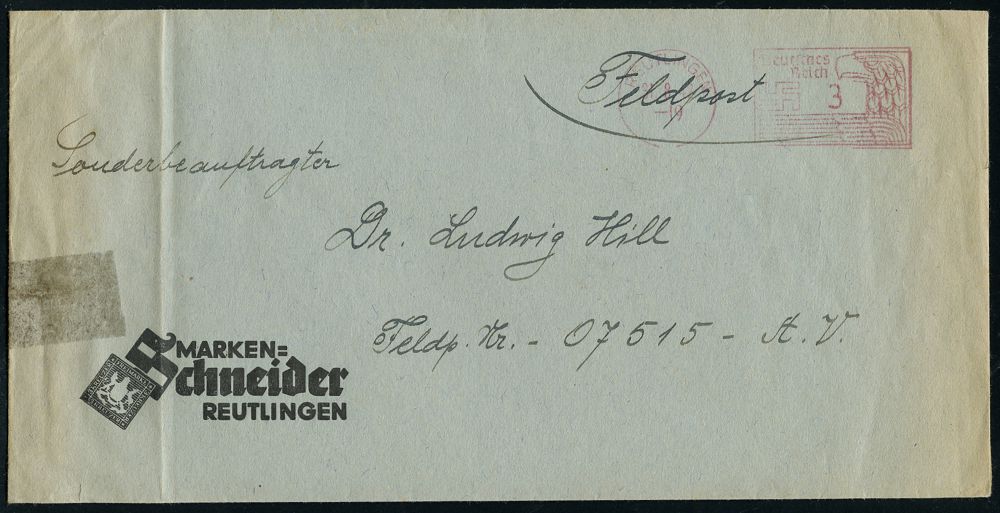 4767 | 40 € | 7410 REUTLINGEN : REUTLINGEN/ Deutsches/ Reich 1942 (31.8.) PFS "Adkerkopf/Hakenkreuz" 3 Pf. auf F e l d p o s t - Firmen-Bf.: MARKEN-Schneider.. (links Tesafleck, gefaltet) = Ausl.-Drs. im Europa-Tarif (= Inland-Tarif) an Feldpost-Nr. 07515 = Belgien, Rüstungs-Inspektion Brüssel, dafür galt k e i n e Feldpost-Portofreiheit, sehr seltene Verwendung! | ![]() | |