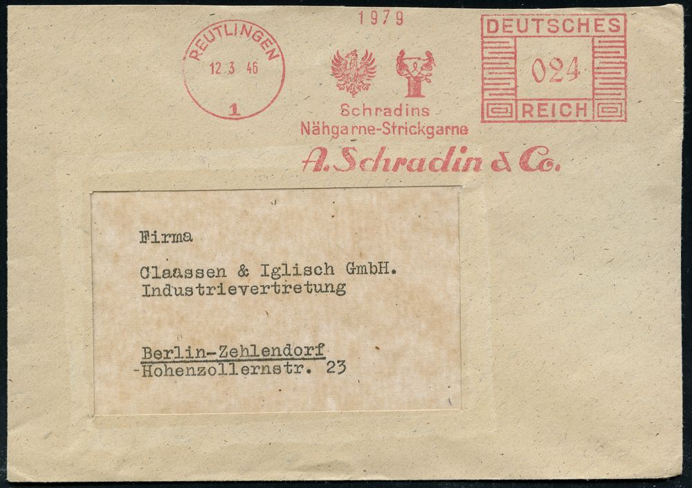 4769 | 25 € | 7410 REUTLINGEN : REUTLINGEN/ 1/ Schradins/ Nähgarne-Strickgarne/ A.Schradin & Co. 1946 (12.3.) AFS Francotyp "Mäanderrechteck" u n v e r ä n d e r t weiterverwendet (Firmen-Logo, rs. kl. Öffnungsmäng.) rs. Abs.-Vordruck, klar gest. Fern-Bf. (Dü.E2CEh, unverändert !) | ![]() | |