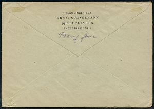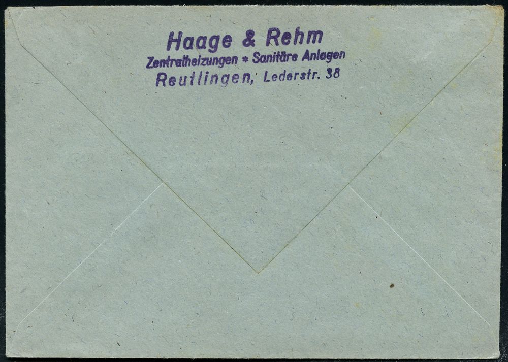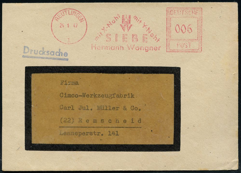 4772 | 20 € | 7410 REUTLINGEN : REUTLINGEN/ 1/ mit X-Naht/ mit Y-Naht/ SIEBE/ Hermann Wangner 1947 (24.1.) AFS Francotyp "Hochrechteck" 006 Pf. , rs. Abs.-Vordruck, Inl.-Drs.-Bf. (Dü.E-18CEo, nur ca. 1 1/2 Jahre verwendet!) | ![]() | |