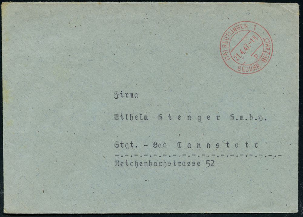 4773 | 8 € | 7410 REUTLINGEN : (14) REUTLINGEN 1/ p/ GEBÜHR BEZTAHLT 1947 (21.4.) 2K-Steg-PFS ohne Wertangabe mit Uhrzeit , rs. Abs.-HdN: Haage & Rehm, Zentralheizungen.. (Dü.A-7 Nr.28 b) | ![]() ![]() | |