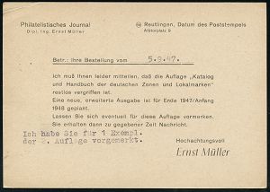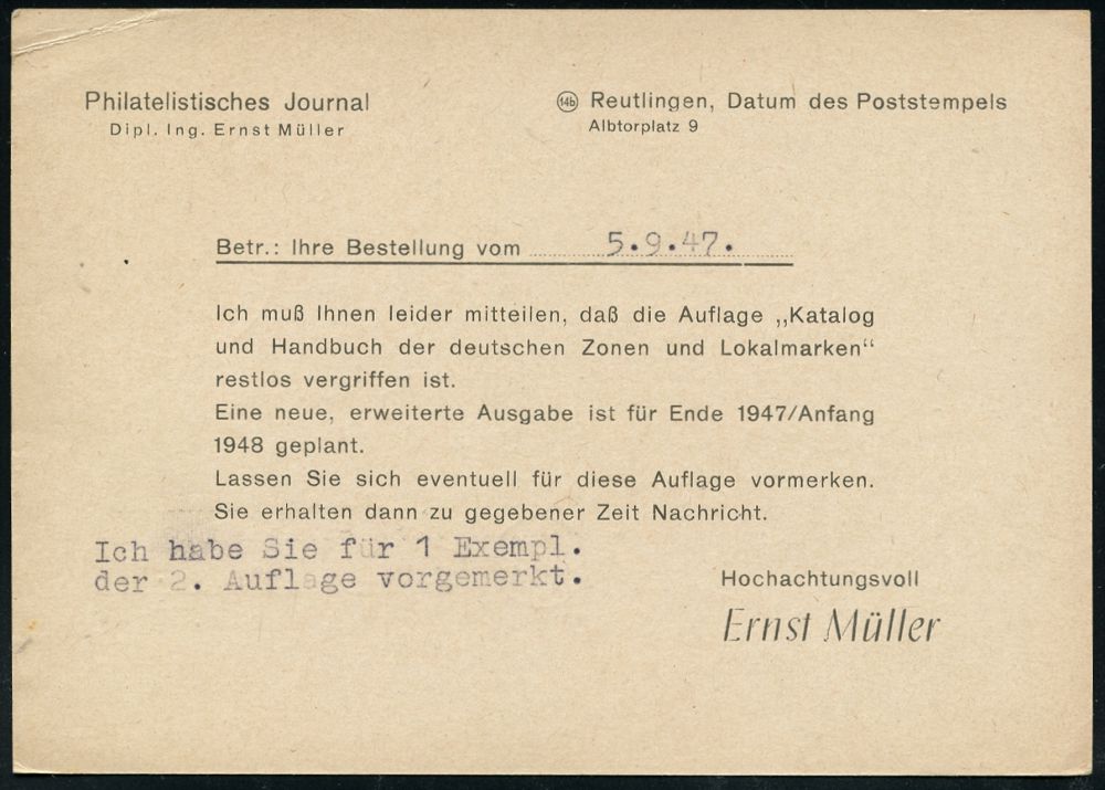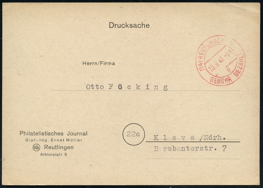 4774 | 8 € | 7410 REUTLINGEN : (14) REUTLINGEN 1/ p/ GEBÜHR BEZAHLT 1947 (10.9.) 2K-Steg-PFS ohne Wertziffer mit Uhrzeit auf Firmen-Kt.: Philatelistisches Journal, Dipl. Ing. Ernst Müller.. (Dü.A-7, Nr.28 b) | ![]() ![]() | |