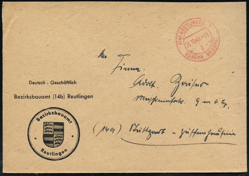 4777 | 9 € | 7410 REUTLINGEN : (14) REUTLINGEN 1/ o/ GEBÜHR BEZAHLT 1949 (28.10.) 2K-Steg-PFS ohne Wertziffer mit Uhrzeit auf Dienst-Bf.: Bezirksbauamt.. mit Wappen (Dü.A-7, Nr.28 b) | ![]() | |