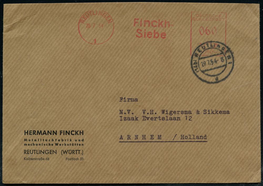 4780 | 16 € | 7410 REUTLINGEN : REUTLINGEN/ 1/ Finckh/ Siebe 1954 (28.7.) AFS Francotyp "Posthorn" mit seltenen CE-Ziffern + 2K-Steg: (14 b) REUTLINGEN 1/d vom 29.7. = Datumskorrektur des Freistempels!, Firmen-Bf.: HERMANN FINCK Metalltuchfabrik.. (Dü.E-23 C Eo) | ![]() | |