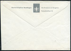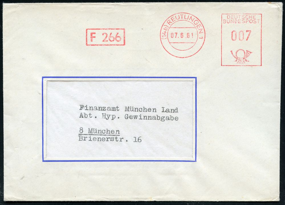 4781 | 16 € | 7410 REUTLINGEN : (14b) REUTLINGEN 1/ F 266 1961 (7.6.) anonymer AFS Francotyp "Posthorn" mit Nummern-Klischee = Probefreistempel für maximal 4 Wochen (Interims-Freistempel) rs. Abs.-Vordruck: Gertel & Spörer.. Druckerei (Dü.E-26 noch alte PLZ) | ![]() ![]() | |