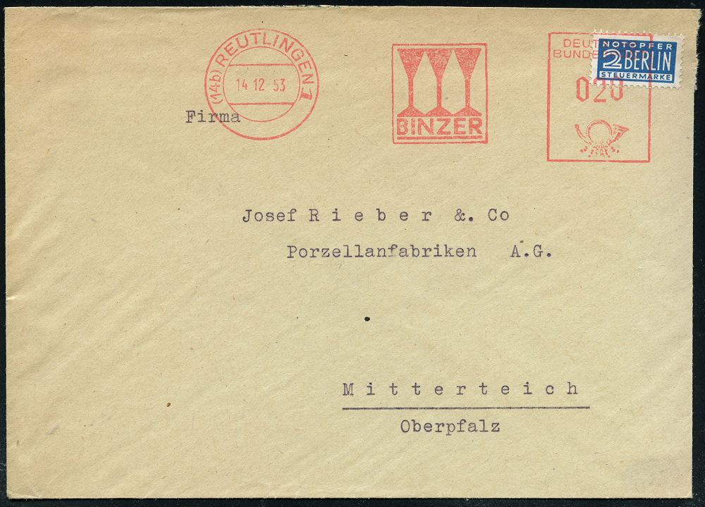 4779 | 15 € | 7410 REUTLINGEN : (14b) REUTLINGEN 1/ BINZER 1953 (14.12.) AFS Francotyp "Posthorn" (3 Sekt-Kelche) auf 2 Pf. NoB (= Vorausentwertung) rs. Abs.-Vordr., Fern-Bf. (Dü.E-23CGo) | ![]() | |