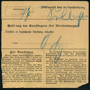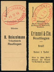 4762 | 25 € | 7410 REUTLINGEN : REUTLINGEN 1/ **/ Gebühr bezahlt 1934/35 roter Oval-PFS ohne Wertangabe u. Uhrzeit je auf Paketkarten-Einl.-Abschnitt der Fa. H. Heinzelmann, Trikotfabrik bzw. Krimmmel & Cie. (Einzelverkauf möglich: je 14.- EUR) 2 Belege (Dü.A-5, Nr.15) | ![]() | |