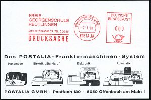 4783 | 16 € | 7410 REUTLINGEN : Reutlingen 1981 (7.1.) AFS.: VORFÜHRSTEMPEL/POSTALIA/FREIE/GEORGENSCHULE.. , seltene Postalia-Musterkt.! (= Specimen) | ![]() | |