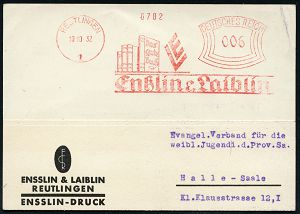 4758 | 20 € | 7410 REUTLINGEN : REUTLINGEN/ 1/ Das gute Buch/ LE/ Enßlin & Laiblin 1932 (10.10.) AFS Francotyp "Bogenrechteck" (Bücherregal mit 4 Büchern) Fern-Kt. an den Evangel. Verband weibl. Jugend n. Halle, von den Nazis 1933 verboten bzw. gleichgeschaltet! (Dü.E-1CEh) | ![]() | |