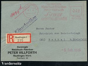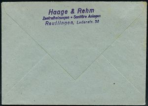 4768 | 18 € | 7410 REUTLINGEN : REUTLINGEN 1/ Vereinigte/ Metalltuch-Fabriken/ Peter Villeforth.. 1946 (9.1.) aptierter AFS Francotyp "Reichsadler" = entfernt = Notmaßnahme! 042 Pf. + RZ: Reutlingen 1, Firmen-R-Vorderseite (Dü.E-13 J-129o) | ![]() | |