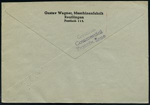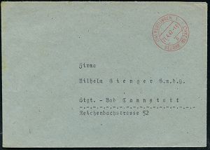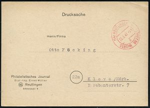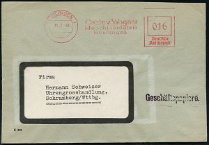 4770 | 20 € | 7410 REUTLINGEN : REUTLINGEN 1/ Gustav Wagner/ Maschinenfabrik.. 1946 (31.7.) aptierter AFS Francotyp "Reichsadler" = entffernt = Notmaßnahme! , rs. Abs.-Vordruck, Fern-Bf. (Dü.E-13 J-127o) | ![]() ![]() | |