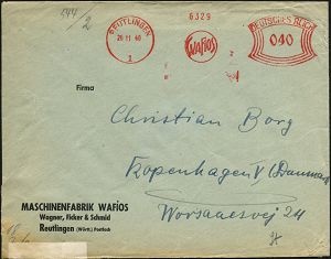 4766 | 28 € | 7410 REUTLINGEN : REUTLINGEN/ 1/ WAFIOS 1940 (26.11.) AFS Francotyp "Bogenrechteck" 040 Pf. + rs. OKW-Zensur-Streifen "Geprüft" + roter 1K m. Tilde = Berlin (Rie.B-3 a, B-51, 80 Pkte.) Firmen-Bf.: MASCHINENFABRIK WAFIOS.., Ausl.-Zensur-Doppel-Bf. n. Kopenhagen (Dü.E-1CEh) | ![]() ![]() | |
