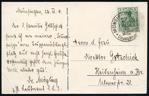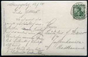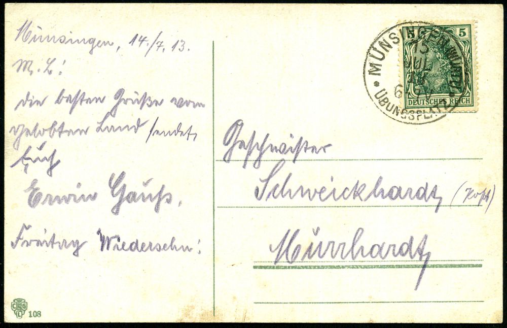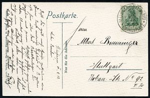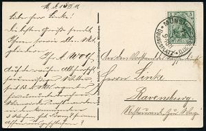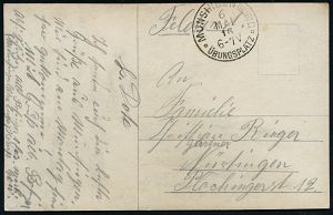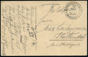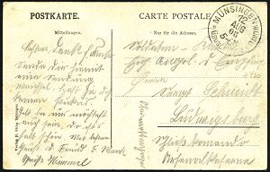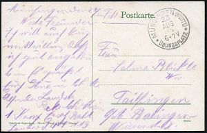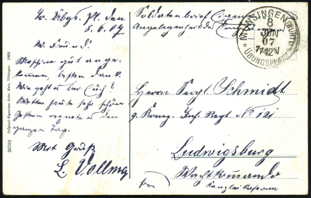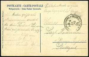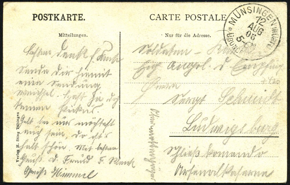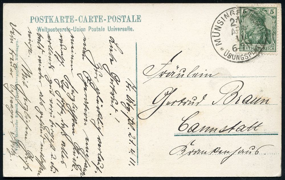 4667 | 15 € | POSTLEITRAUM 7400 (OHNE REUTLINGEN u. TÜBINGEN) : MÜNSINGEN (WÜRTT)/ *ÜBUNGSPLATZ* 1907 (8.6.) 1K = Hauspostamt Truppenübungsplatz + hs. Zusatz: "Soldatenbrief Eigene Angelegenheit des Empängers" , portofreie Militär-Color-Ak.: Schloss Lichtenstein (10 Detail-Ansichten) n. Ludwigsburg = Manöver-Feldpost! | ![]() ![]() | |