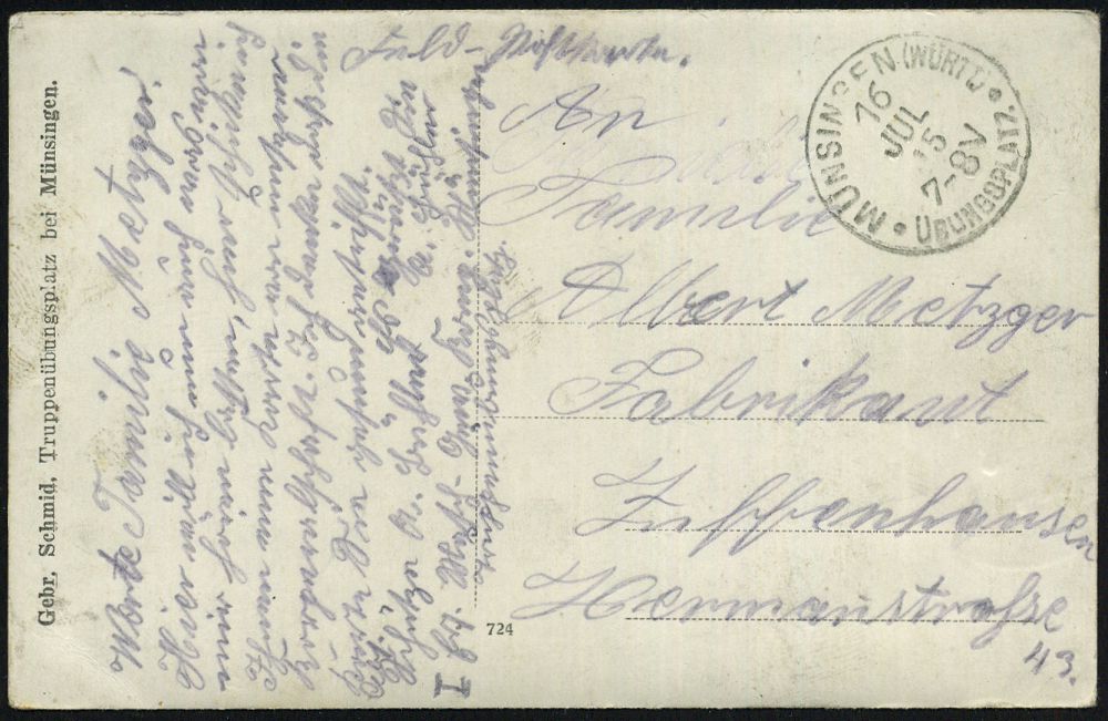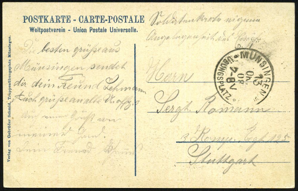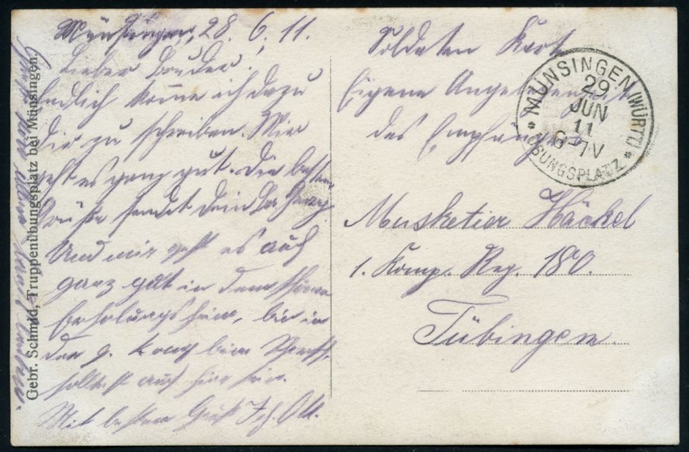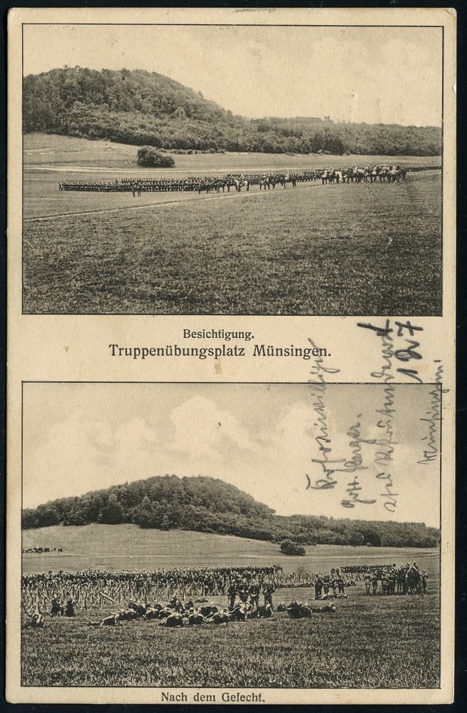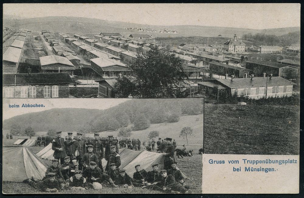 4666 | 15 € | POSTLEITRAUM 7400 (OHNE REUTLINGEN u. TÜBINGEN) : MÜNSINGEN (WÜRTT)/ *ÜBUNGSPLATZ* 1906 (12.8.) 1K = Hauspostamt Truppenübungsplatz + hs. Vermerk "Soldaten-Brief, Eig. Angel. d. Empfängers" , portofreie Militär s/w.-Foto-Ak.: Truppenübungsplatz MÜNSINGEN = Bäckerei n. Ludwigsburg = Manöver-Feldpost! | ![]() ![]() | |