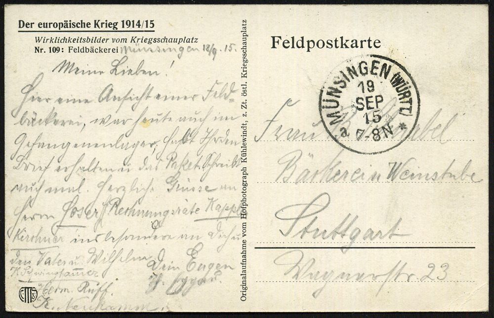 4689 | 14 € | POSTLEITRAUM 7400 (OHNE REUTLINGEN u. TÜBINGEN) : MÜNSINGEN (WÜRTT)/ a* 1915 (19.9.) 1K auf Color-Feldpost-Ak. Nr. 109: Feldbäckerei (Foto Hofphotograph Kühlewindt) n. Stuttgart | ![]() ![]() | |