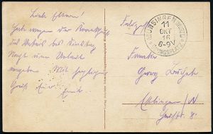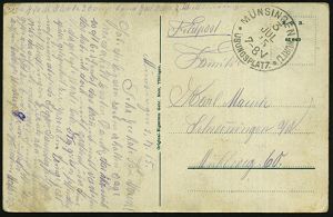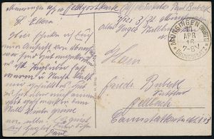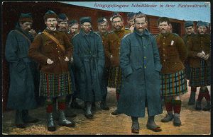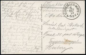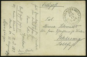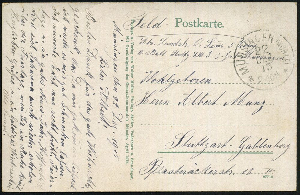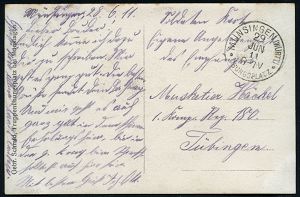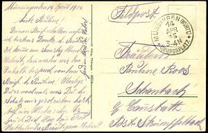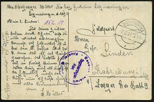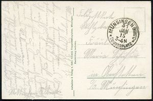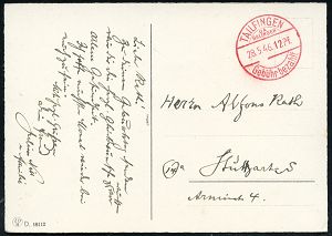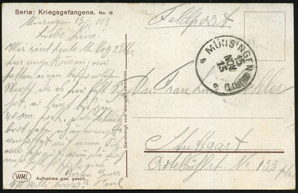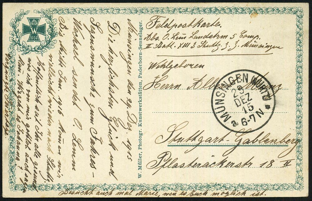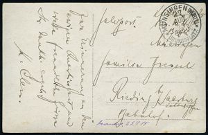 4691 | 11 € | POSTLEITRAUM 7400 (OHNE REUTLINGEN u. TÜBINGEN) : MÜNSINGEN (WÜRTT)/ a* 1915 (22.12.) 1K auf Color-Feldpost-Ak.: Kriegsgefangenen Schottländer.. + hs Abs. (Landsturm) mit Zensurvermerk: Mit Genehmigung des Generalkommandos n. Stuttgart (Uhv. Verlag Walter Müller) | ![]() ![]() | |
