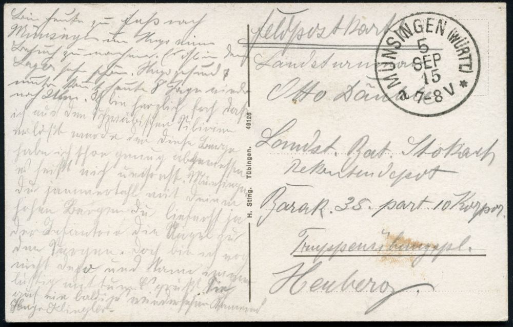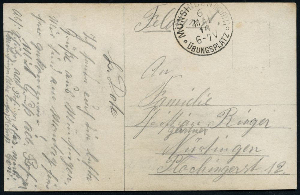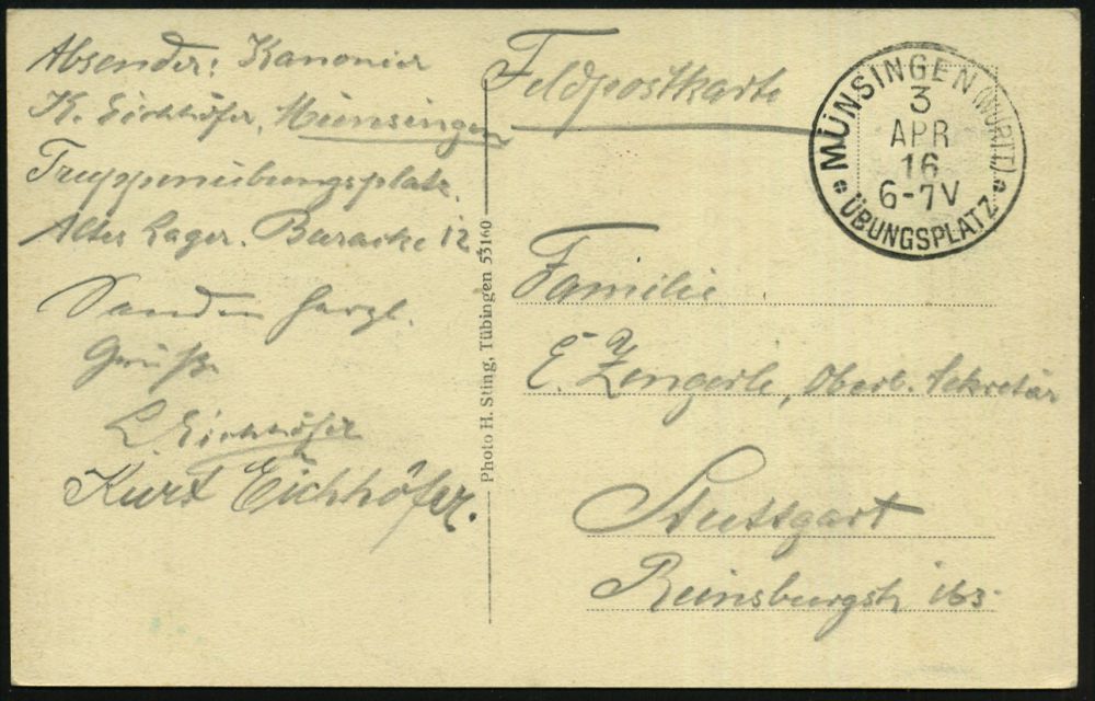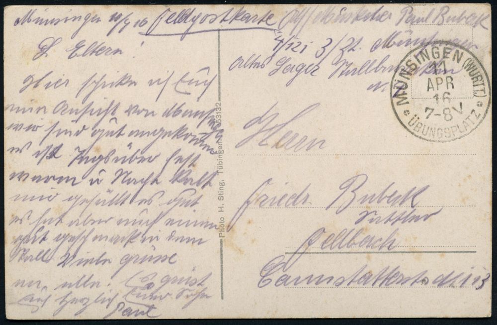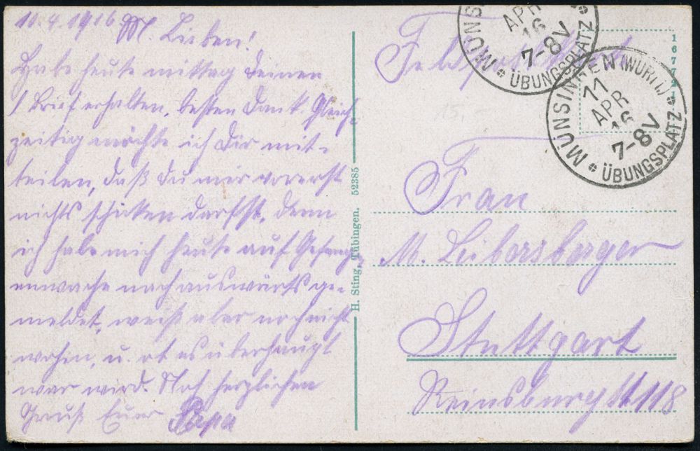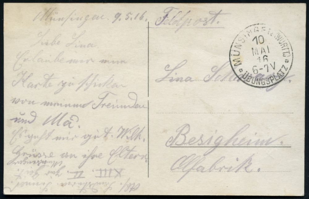 4697 | 14 € | POSTLEITRAUM 7400 (OHNE REUTLINGEN u. TÜBINGEN) : MÜNSINGEN (WÜRTT:)/ ÜBUNGSPLATZ 1916 (10.5.) 1K = Hauspostamt Truppenübungsplatz + hs. Abs. Landsturm, individuelle s/w.-Foto-Ak.: 3 Landsturm-Soldaten n. Besigheim | ![]() ![]() | |