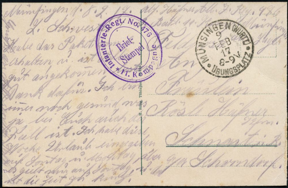 4700 | 12 € | POSTLEITRAUM 7400 (OHNE REUTLINGEN u. TÜBINGEN) : MÜNSINGEN(WÜRTT.)*ÜBUNGSPLATZ* 1917 (9.2.) 1K = Hauspostamt Truppenübungsplatz + viol. Dreifach-Oval: Infanterie-Regt. No. 476/ 11. Kompanie , klar gest. Color-Feldpost-Ak.: Schloß Lichtenstein n. Schnait i. R. | ![]() ![]() | |