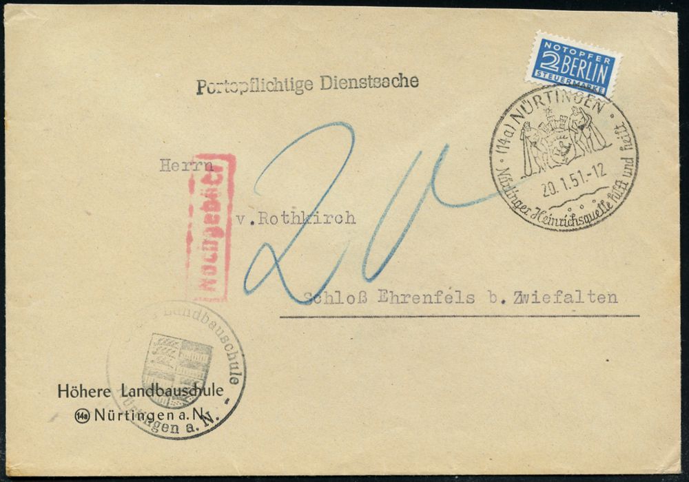 4719 | 16 € | POSTLEITRAUM 7400 (OHNE REUTLINGEN u. TÜBINGEN) : (14a) NÜRTINGEN/ ..Heinrichsquelle hilft u.heilt 1951 (20.1.) HWSt auf EF 2 Pf. NoB + roter Ra: Nachgebühr + viol. 1L: Portopflichtige Dienstsache , Dienst-Nachporto-Bf.: Höhere Landbauschule (Bo.3) | ![]() | |