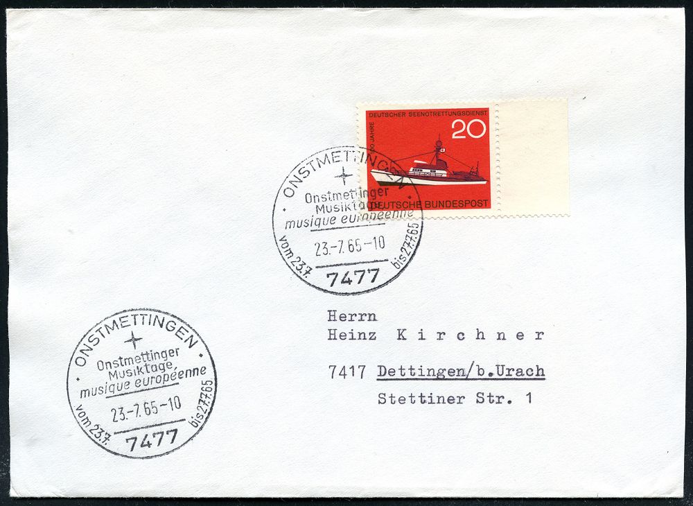4730 | 12 € | POSTLEITRAUM 7400 (OHNE REUTLINGEN u. TÜBINGEN) : 7477 ONSTMETTINGEN/ Onstmettinger/ Musiktage/ musique européenne 1965 (23.7.) SSt klar auf Inl.-Bf. (Bo.5) | ![]() | |